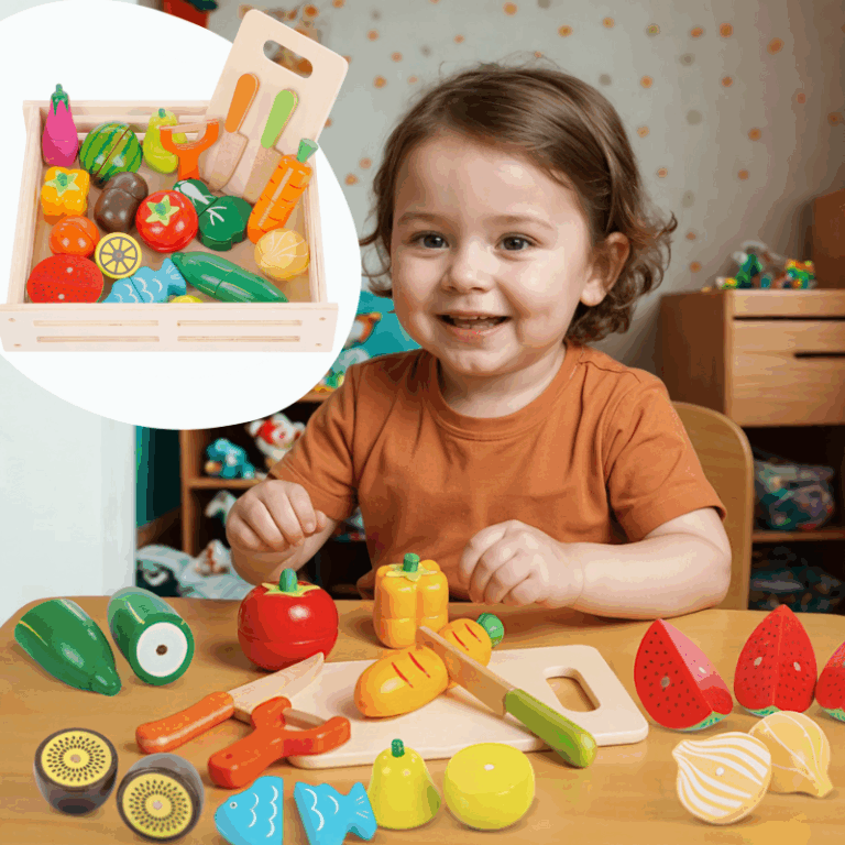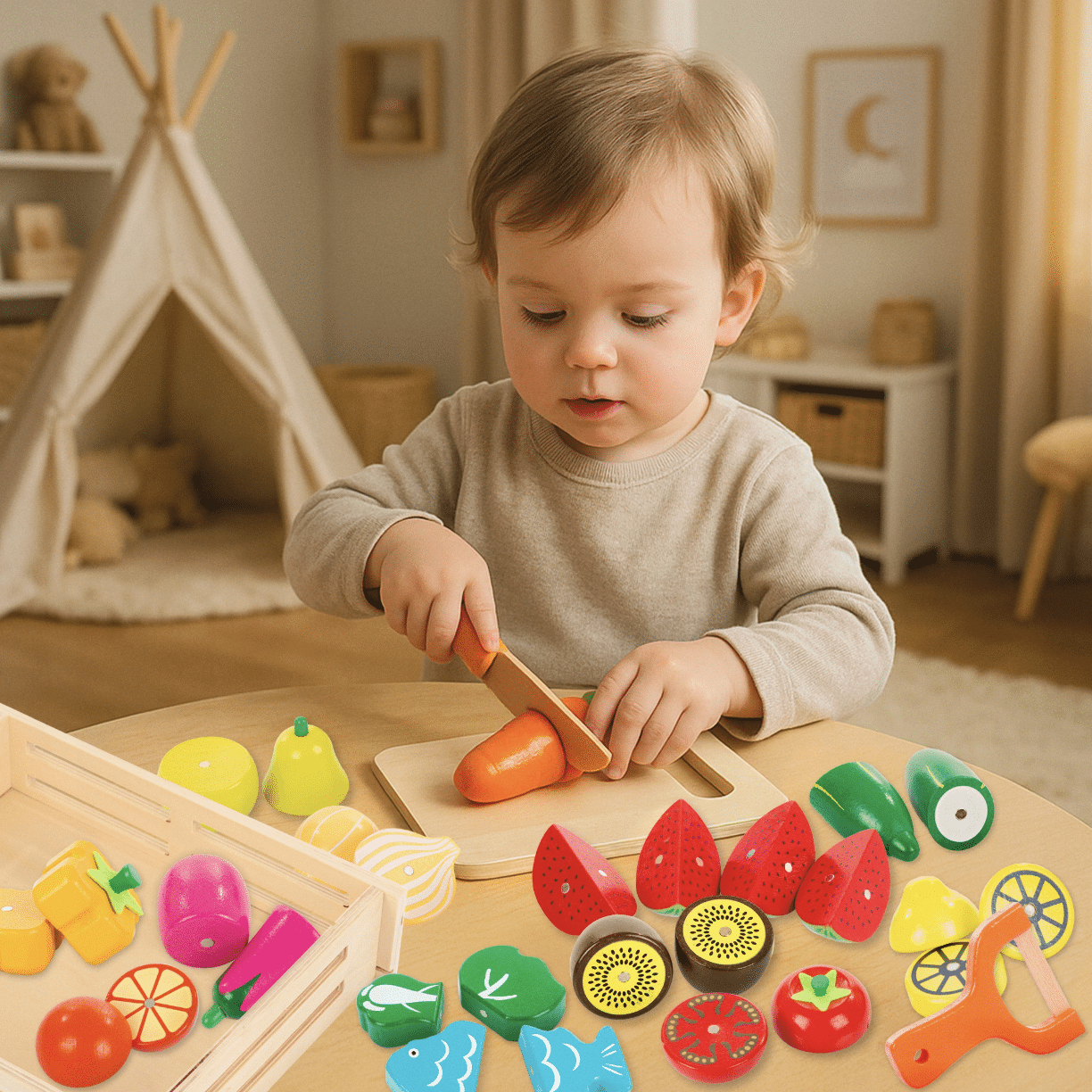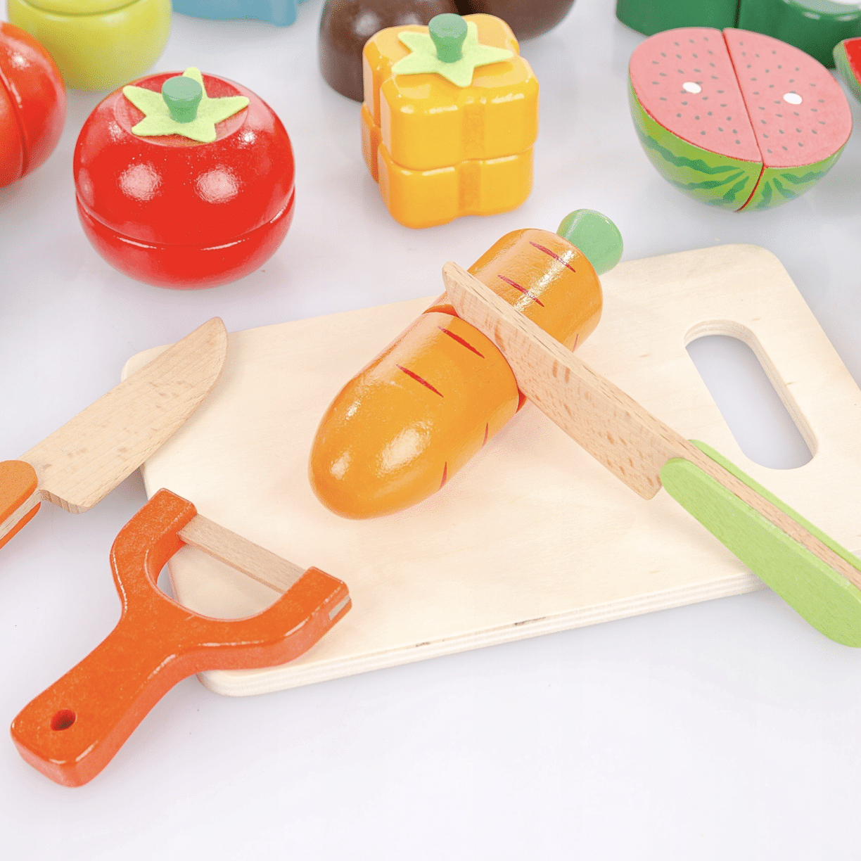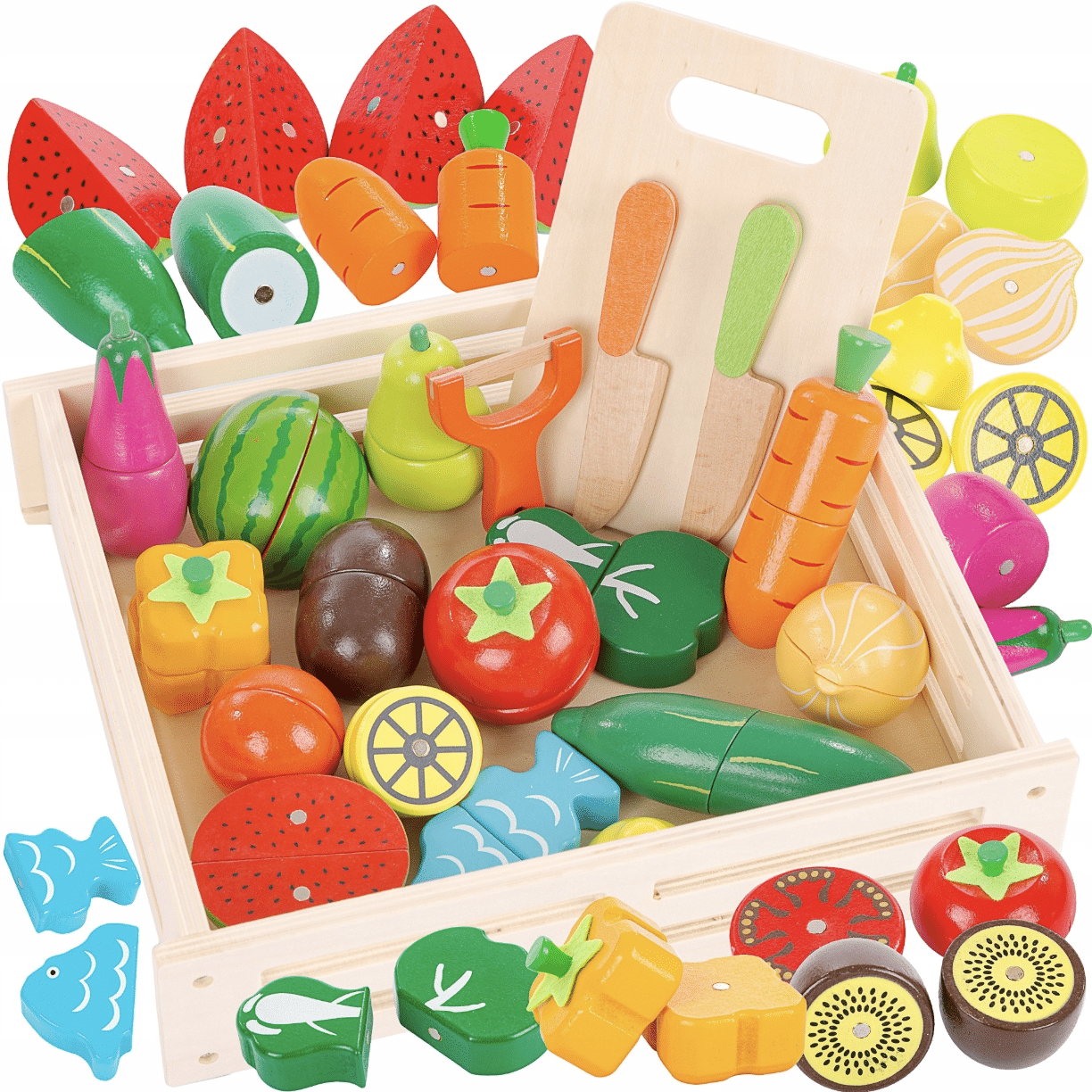 Ovoce, zeleninu i rybu lze „překrojit“ dřevěným nožem, který je součástí sady, a poté jednoduše znovu spojit pomocí magnetů ukrytých uvnitř. Díky průřezu dítě snadno pozná, jak potraviny vypadají i zevnitř.