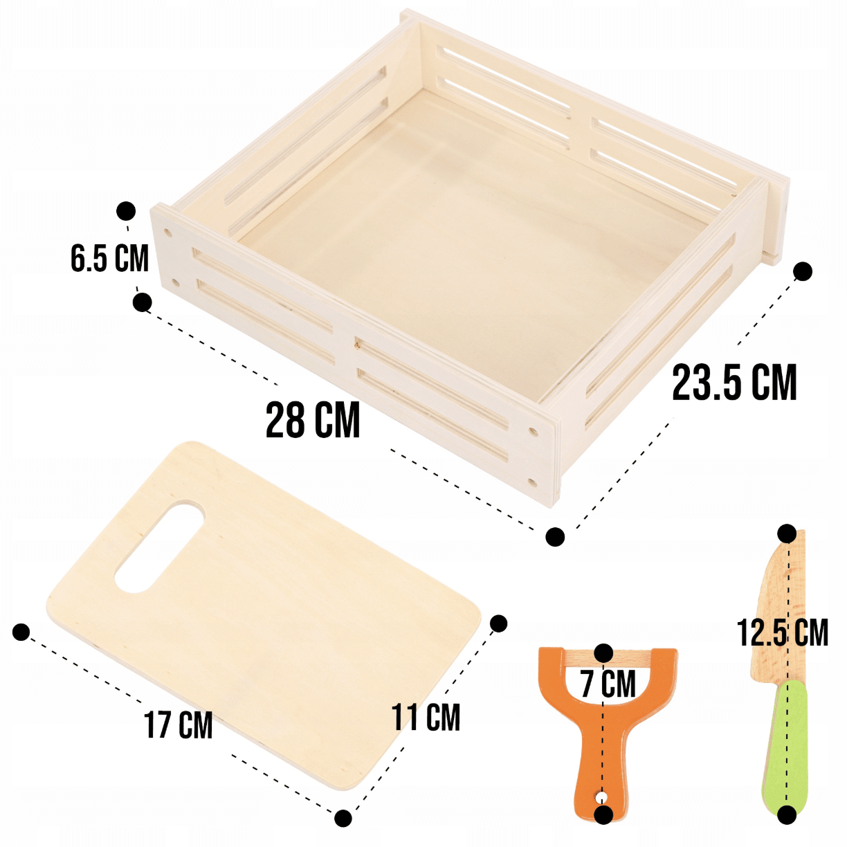 V praktické dřevěné bedýnce najde dítě vše, co potřebuje každý malý kuchař. Jednotlivé potraviny jsou spojeny magnety, takže je lze snadno „krájet“ a znovu skládat dohromady.